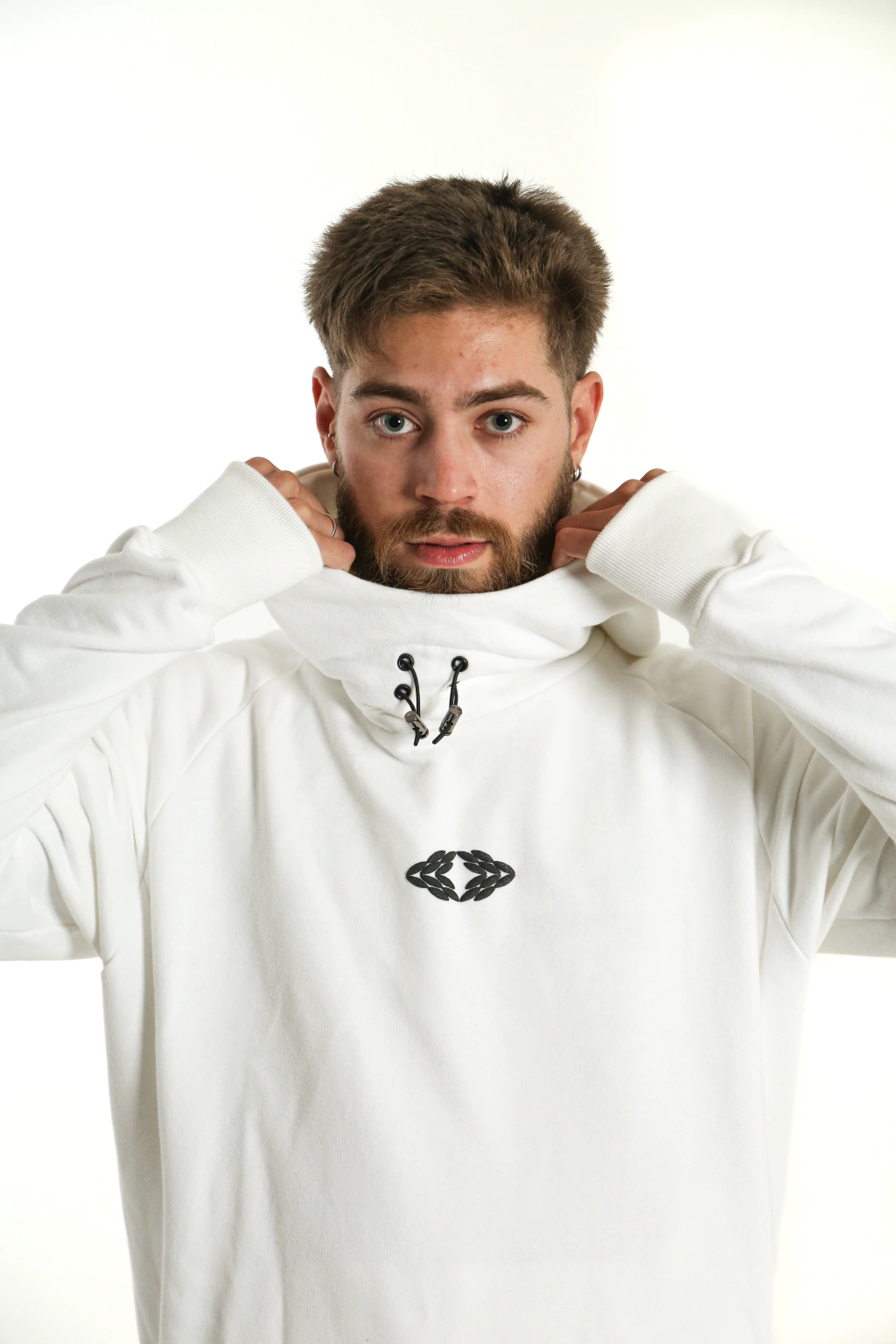 Bolso canguru embutido com zíperes invisíveis, mangas com furo para o polegar e serigrafia nas costas criam um moletom sofisticado, funcional e urbano.